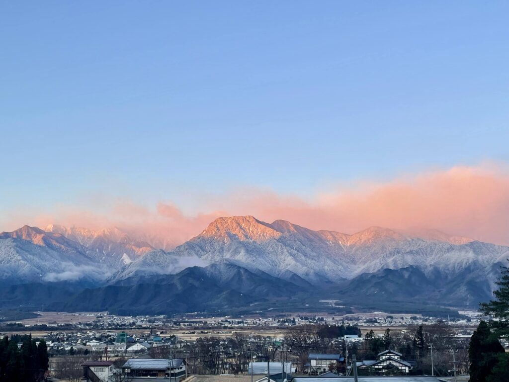 冠雪した北アルプスに朝日があたり雪がピンク色にそまる、冬ならではの美しい景色です。
