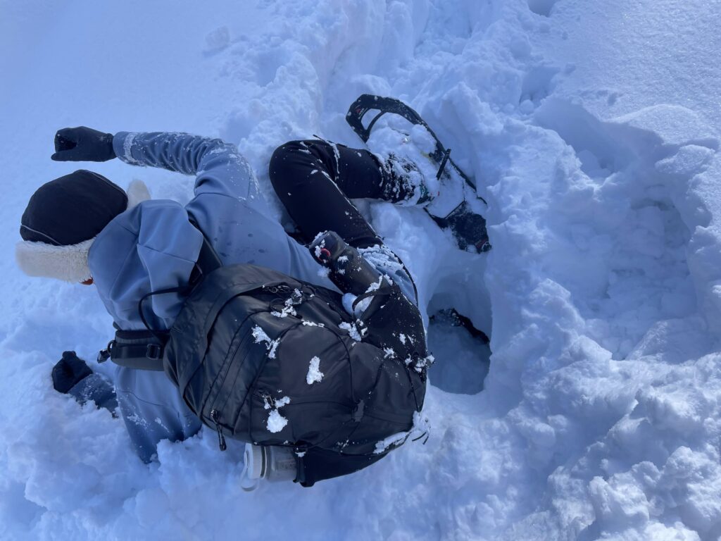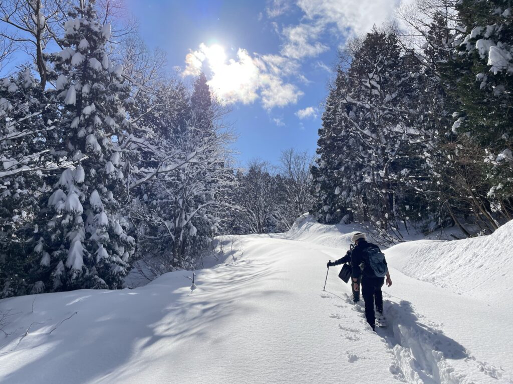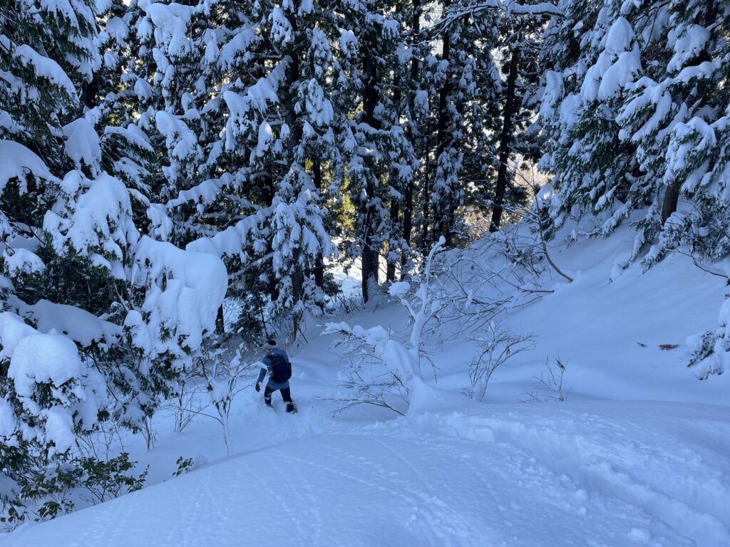 スノーシュー履いてても膝まで沈むんですから…そりゃもう大汗かきながらのラッセルラッセル!