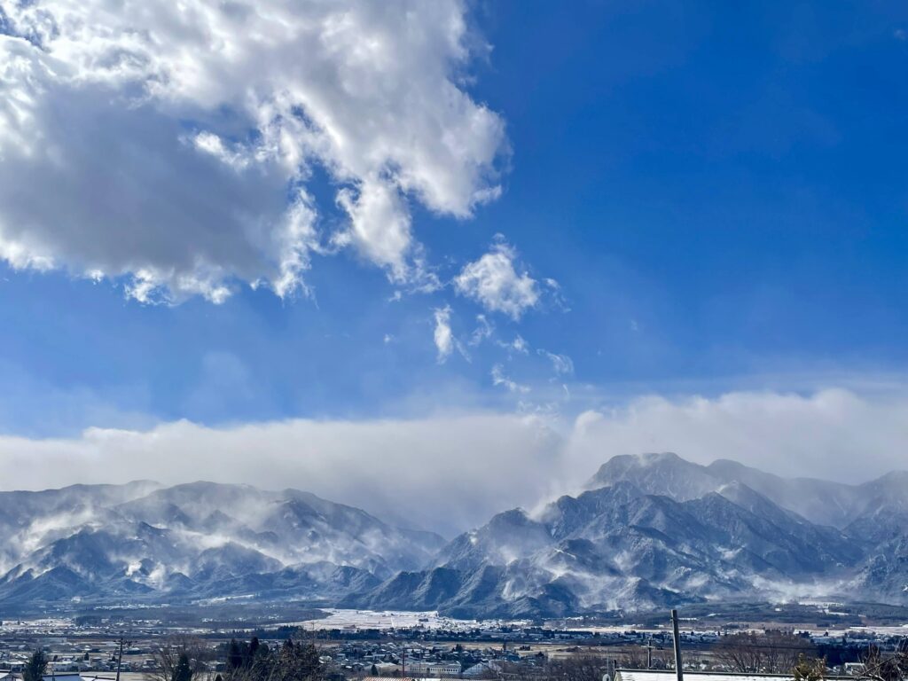 北アルプスは雲の中に隠れているけれど、山が雪煙をまとう一瞬一瞬の景色が美しすぎて…