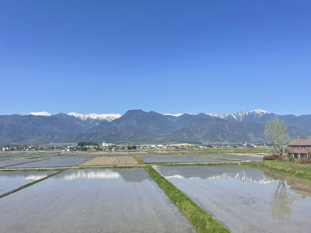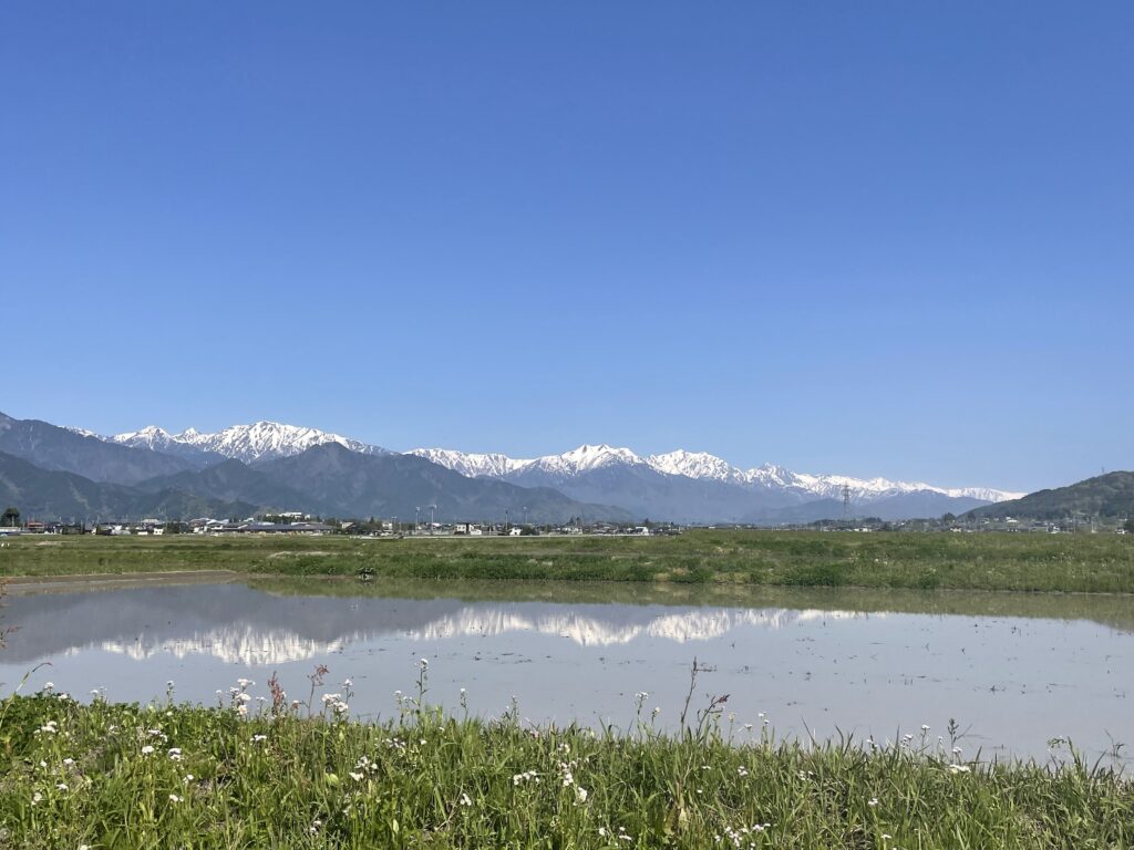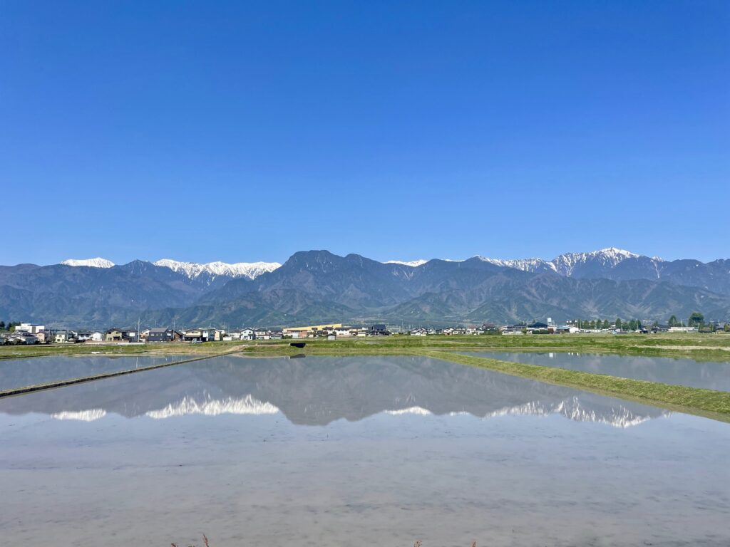 この時期楽しみなのが、北アルプスの残雪が田んぼに映る水鏡の風景です✨